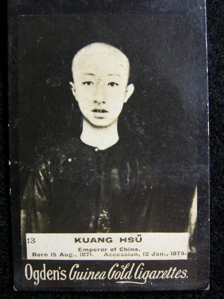 1900年英國鄂丁香煙公司發(fā)行大清光緒皇帝真像照片卡 (珍貴)。整個(gè)維新不過歷時(shí)103天,故稱“百日維新”。1908年11月14日光緒帝病死,享年38歲,葬于清西陵的崇陵。