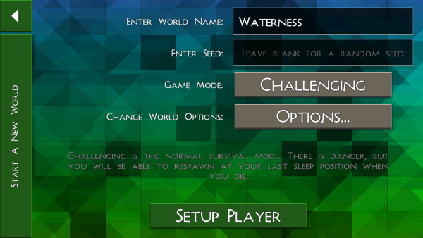 點擊“new world”后,我們需要對創建世界,進行自定義的設置,設置完成后點擊“setup player”