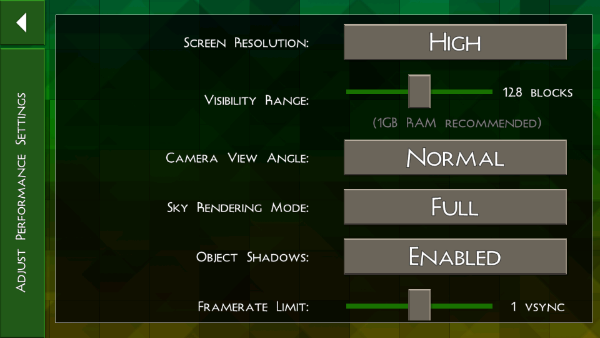 “settings”中的“performance”中,我們還可對游戲中的畫質進行自定義設置,對于設備配置較低的玩家,可適當的降低畫質,來提高游戲的流暢性