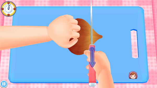 根據系統指引,我們滑動菜刀來切洋蔥。