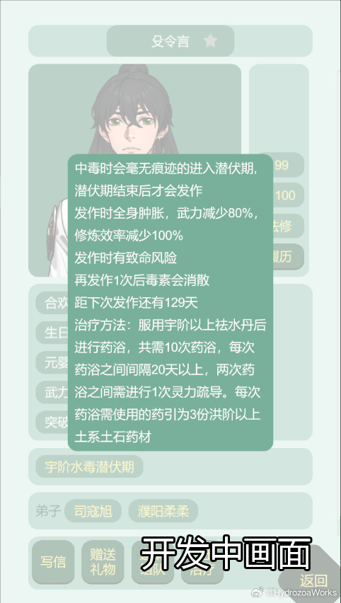 下情毒,但親自下友好度會(huì)大減。發(fā)作期可雙修但不漲好感。下水毒,治療他的時(shí)候觸發(fā)心動(dòng)劇情,心動(dòng)劇情出現(xiàn)4次或者觸發(fā)其他人嫉妒的劇情就說(shuō)明攻略成功。和尚不能生娃,只能魂契下輩子到別的門派。