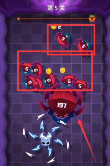 第5關(guān)攻擊BOSS它會分裂出小怪物,所以我們要優(yōu)先將BOSS擊殺,不要管小怪物;