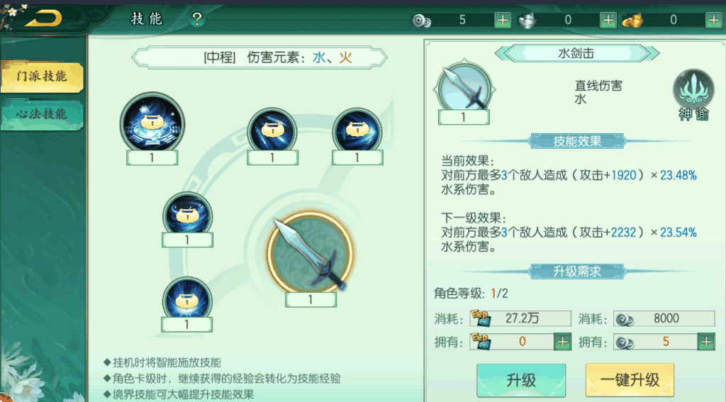 注意:心法技能可學(xué)習(xí)的等級(jí)與角色等級(jí)有關(guān),且當(dāng)心法技能達(dá)到滿級(jí)后無(wú)法再繼續(xù)提升。