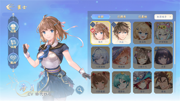 在雀士這個(gè)界面,玩家可以自由查看已獲得和未獲得的各種雀士,并且為雀士搭配不同的時(shí)裝,查看他們的屬性加成,并且還可以通過(guò)送禮還提升羈絆值,解鎖隱藏劇情。