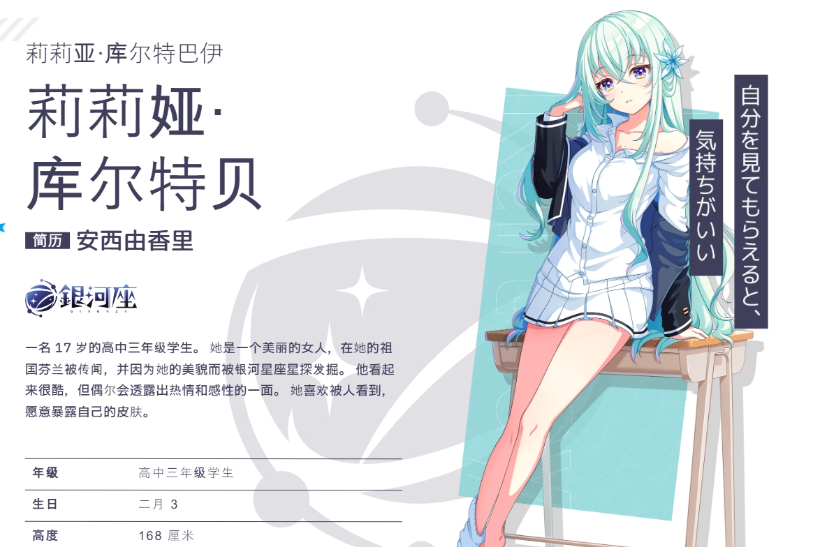 17歲,高中三年級學生。她在祖國芬蘭被傳為美女,并因美貌被Gingaza 發(fā)掘。他看起來很酷,但有時也會表現(xiàn)出熱情和感性的一面。他喜歡被人看見,也很主動地暴露自己的皮膚。