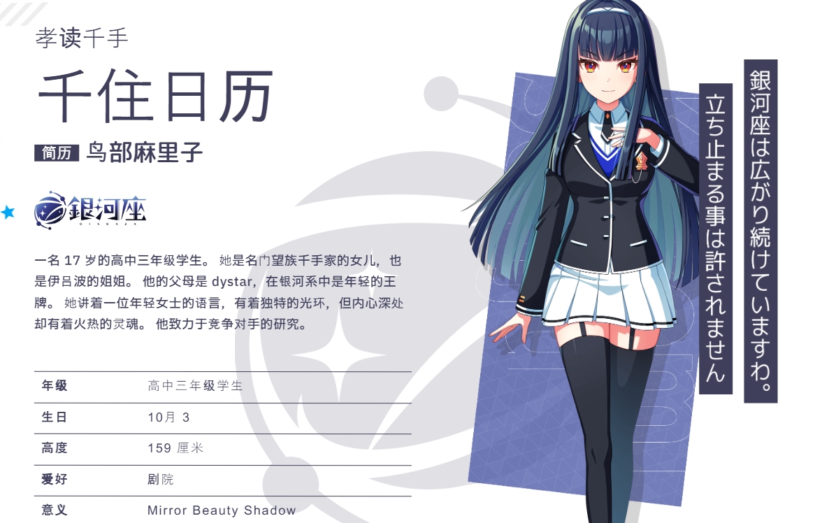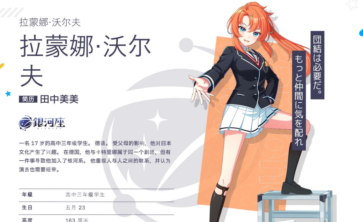 17歲,高中三年級學生。德語。在父母的影響下,他對日本文化產(chǎn)生了興趣。在德國,她與卡特里娜屬于同一個劇團,但因某事而加入了Gingaza。他重視人與人之間的聯(lián)系,認為演員也需要有紐帶。