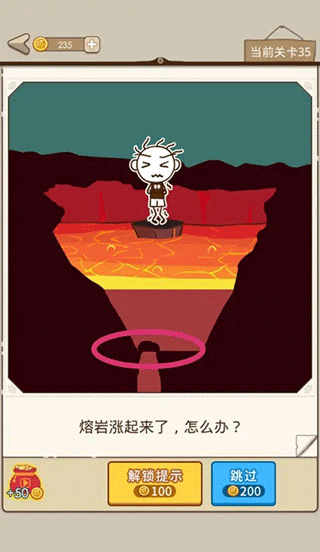 熔巖漲起來(lái)了,點(diǎn)擊移開圖示位置的小石頭,熔巖就會(huì)流動(dòng)下去了。
