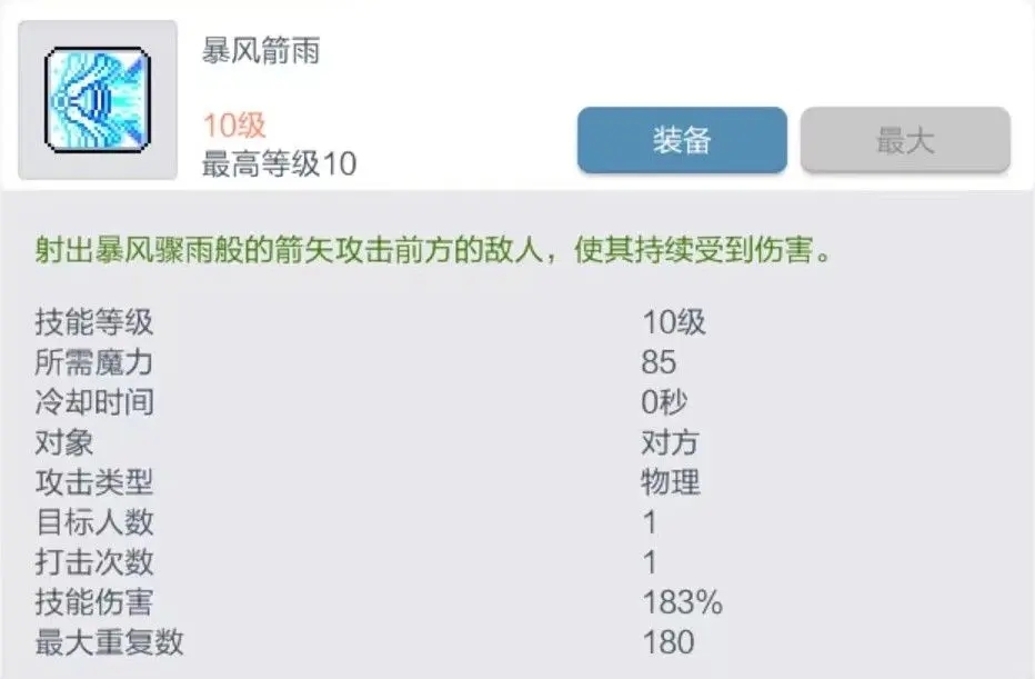 在遠征副本面對BOSS時,暴風箭雨的效果會更加明顯,相比于驟雨箭矢,暴風驟雨的目標人數與打擊次數都為1,與風之矢相同,技能傷害相比于驟雨箭矢也較低,但是暴風箭雨共計可以打出180支箭并且在釋放過程中允許移動和跳躍,相比于驟雨箭矢,靈活性更高,更容易躲閃BOSS的技能,因此在遠征副本BOSS戰中,這一時期的技能搭配為箭矢炮盤+火鳳凰+暴風箭雨+箭矢炮盤。