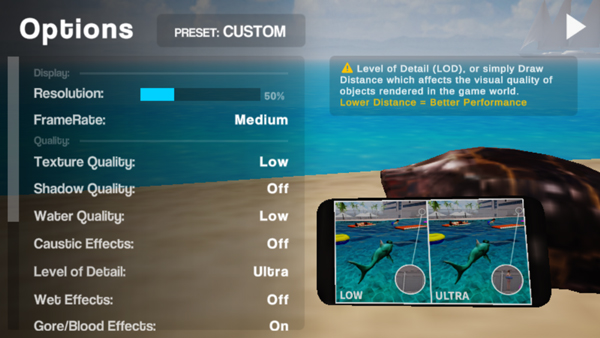 1、啟動鯊魚之怒的最新版本游戲,于游戲尚未開始時,點擊右上角的齒輪圖標,就能對游戲畫質、畫面效果等進行調節。