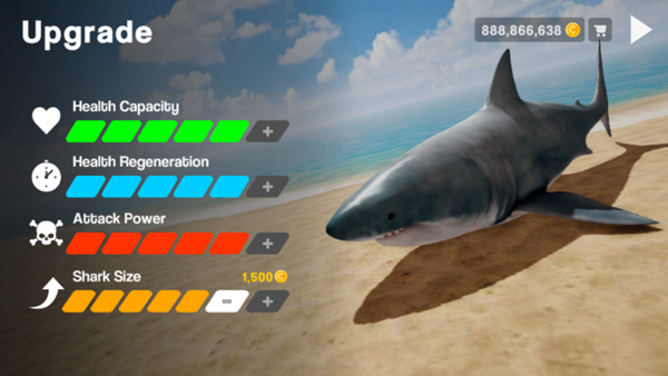 3、能力提升:玩家能夠借助升級、購買道具等多種途徑,來提升鯊魚的能力。