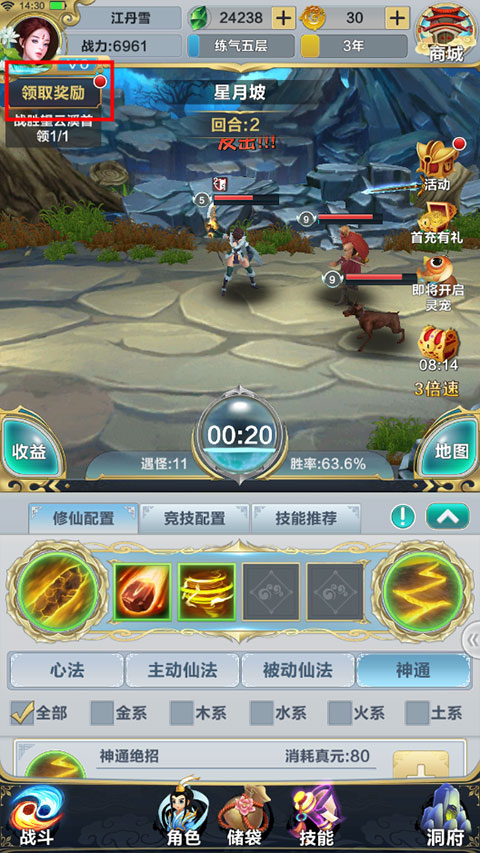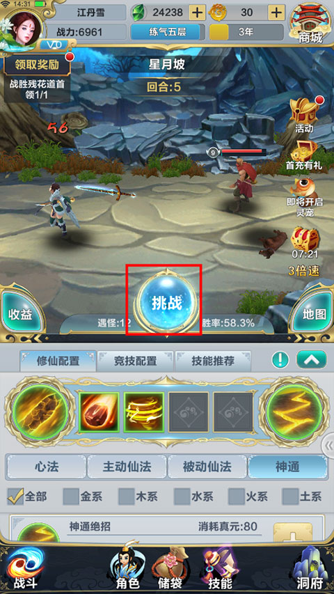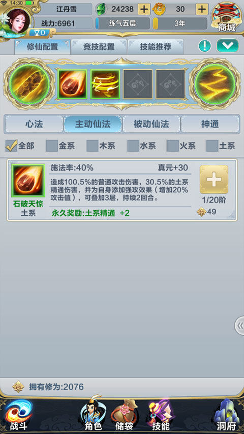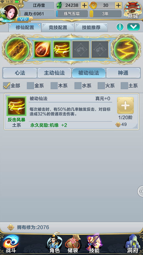 主動仙法作為核心輸出方式,在戰(zhàn)斗過程中依據(jù)自身的施法率以概率形式進行施放,同時積攢真元。