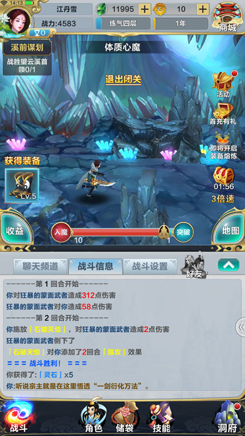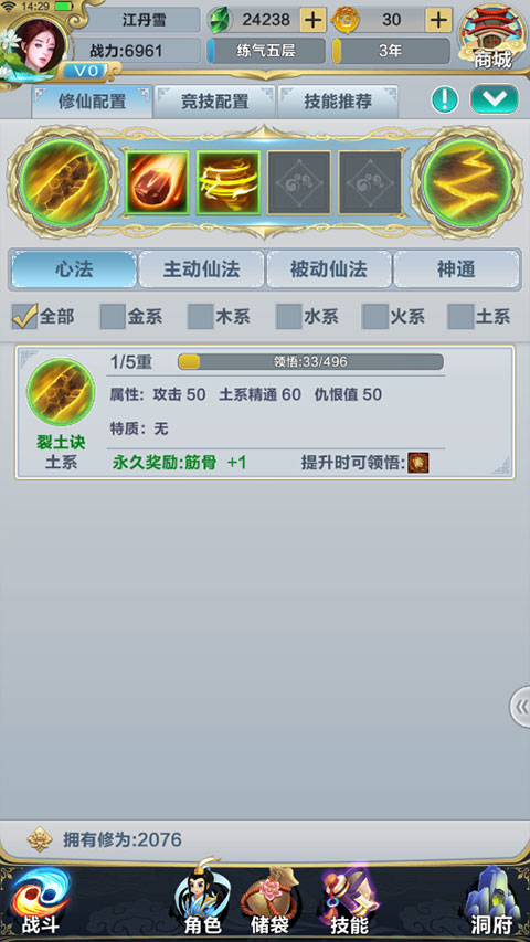 心法決定了技能搭配策略,關(guān)卡中獲得修為的同時,會增加已裝配心法的領(lǐng)悟值,心法等級提升后可領(lǐng)悟仙法;