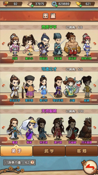 包含弟子、武學、客卿三個圖鑒合集,前期主要是完成任務的方式獲得弟子、武學以及客卿,當完成招募條件時,可在圖鑒處招該弟子或客卿。