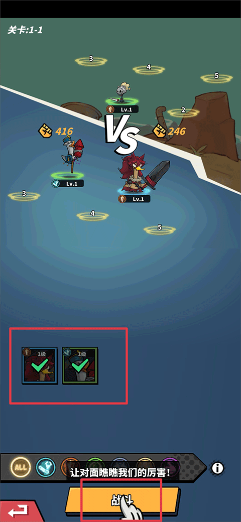 2、進入之后,第一步先合理安排各類鴨子上場,安排妥當后點擊戰斗,戰斗獲勝就能獲取獎勵。