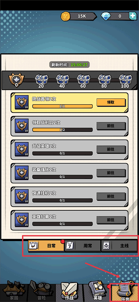 3、玩家不僅需要完成章節任務,在任務頁面里,還有各式各樣的日常任務、周常任務以及主線任務等待著玩家去完成。