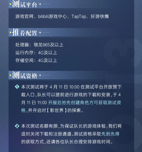 測試平臺:游戲官網(wǎng)、bilibili游戲中心、TapTap、好游快爆