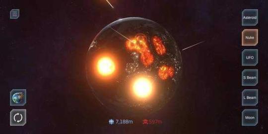 毀滅星球模擬器中文版,這是一款超解壓的模擬器游戲。在這個版本中,所有武器都已解鎖。要知道,毀滅星球看似是天方夜譚,但在游戲里,你能用最簡單直接的方式做到。各種武器所展現出的毀滅效果大不相同,盡情使用它們來摧毀星球吧。