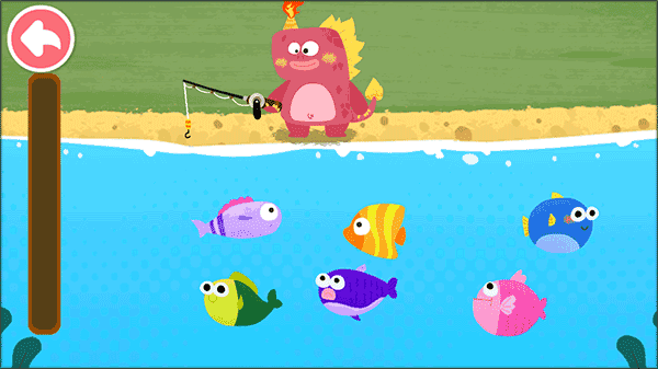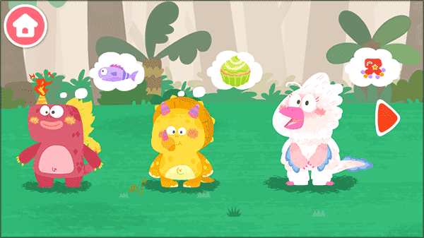 接下來就可以烤魚啦!撥開草叢,尋找柴火;點燃柴火,串好小魚開始燒烤。香噴噴的魚已經烤好,寶寶別忘了和其他恐龍朋友共同分享!