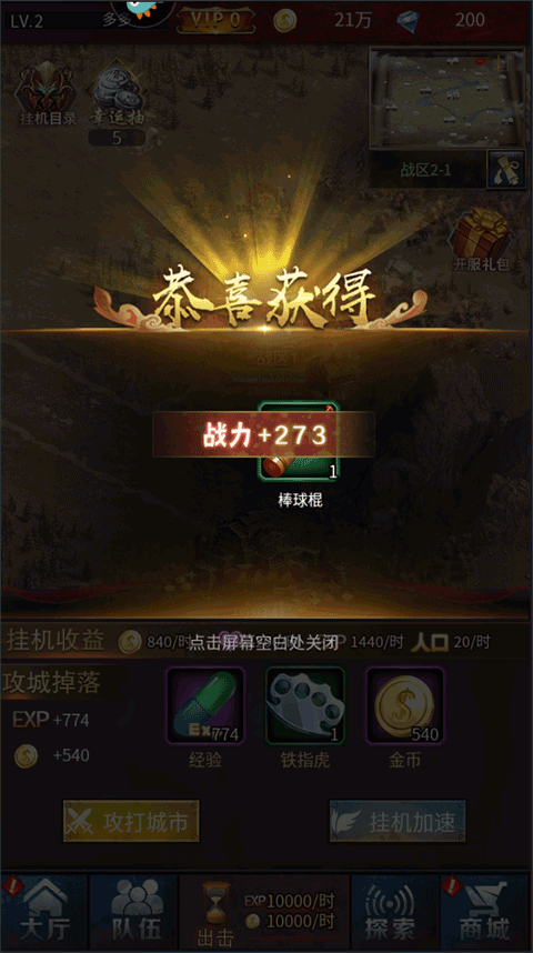 1、啟動游戲后,于游戲內能夠選擇掛機以增強力量,在此處點擊掛機加速。
