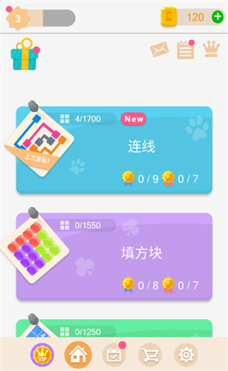 游戲中有連線、填方塊、七巧板、一筆畫、逃脫、數字連線、接水管、滾球、顏色找茬、推箱子等多種玩法,這里我們選擇連線玩法;