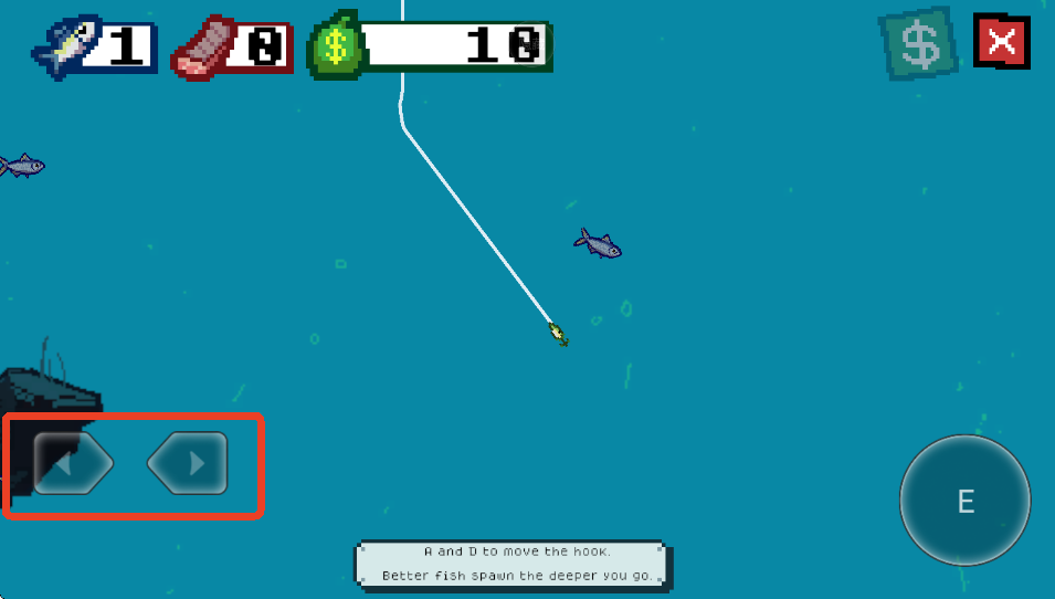 使用右下角的按鍵來控制魚鉤的方向。用魚鉤撞擊一條魚,對它造成傷害,傷害足夠后將它釣上來。