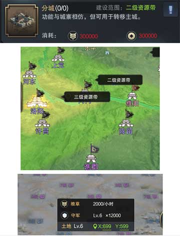 二級資源帶屬于高級遷城范疇,要開啟分城,需學問府達到14級并研究相關科技。不過,在此過程中能夠自主選擇精準位置,遷城后可獲取更大量的資源以及更高的存儲上限。只是二級資源帶土豪眾多,競爭異常激烈,若沒有一定實力,很難在此有所作為。至于三級資源帶,則要求主城和學問府均達到22級,同時還需要武力和統率均在92以上的武將。