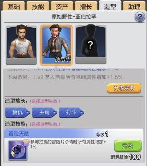 技能欄展示了當前藝人所擁有的技能,從而區分了“站街藝人”“寵兒藝人”“普通藝人”等不同類型。圖中冒險天賦技能是當狼叔穿上造型卡后額外獲得的一個隱藏技能加成,這個在后續的介紹中會具體說明。