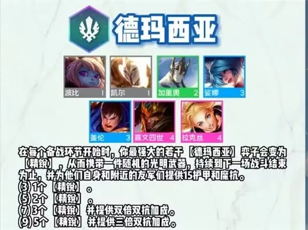 在每個備戰環節開始時,你最強大的若干[德瑪西亞]棋子會變為