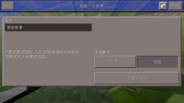 點擊“創建新的世界”,在生存或創造模式中選擇其一,再點擊創建世界就能正式進到游戲。