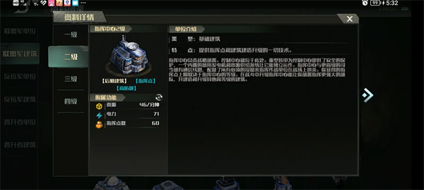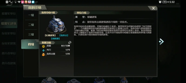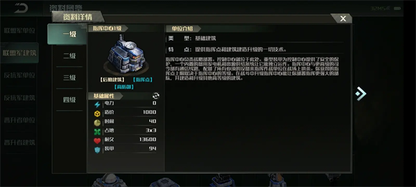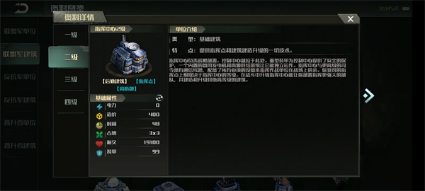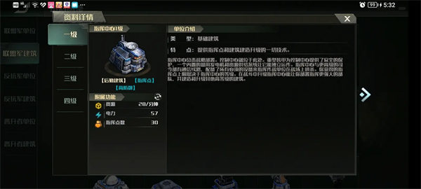1級(jí):提供:28資源/每分鐘,提供電力57度,提供30點(diǎn)指揮點(diǎn)數(shù)。
