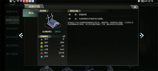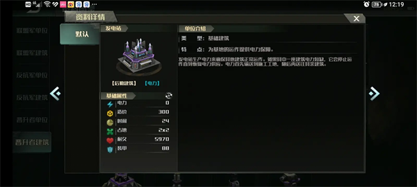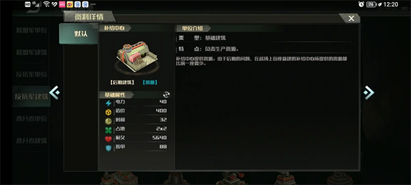 所有建筑皆為Ill級(jí)甲(即游戲里的重型裝甲)。為便于理解,游戲中的補(bǔ)給點(diǎn)統(tǒng)一以(錢/資源)表示,電力以(度)表示,耐久以(生命/血)表示。