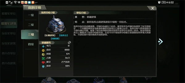 在其他建筑生命值普遍較少的情況下,反抗軍的指揮中心在1到3本時(shí),生命值卻比其他兩個(gè)陣營要多,具體數(shù)值分別為:1本19100血,94甲;2本24600血,99甲;3本29860血,104甲。