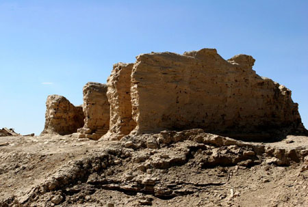 俯瞰樓蘭古城,城中東北角有一座烽燧,雖然經(jīng)過歷代不同時期的補修,但依然可以看出最早漢代建筑的風(fēng)格。 烽燧的西南是“三間房”遺址。這座100平方米的房屋,建筑在一塊高臺上,三間房正中的一間要比東西兩間顯得寬大。20世紀(jì)初,斯文.赫定曾在東面一間房內(nèi)發(fā)掘出大量的文書簡。從三間房西廂房殘存的大木框架推測,這里昔日曾是城中屯田官署所在地。繼續(xù)向西,是一處大宅院。院內(nèi),南北各有3間橫向排列的房屋。在古城,這座院落建筑也是比較排場的。相形之下,大宅院南面的房舍多數(shù)是單間,矮小、散雜而破敗不堪。如果根據(jù)出土文書推測,三間房毗鄰的框架結(jié)構(gòu)房屋是樓蘭古城的官署遺跡。