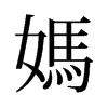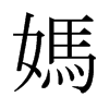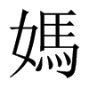 ● 媽 mā ?ㄇㄚˉ ◎ “媽”的繁體字。 ◎ 稱謂:(1) 對母親的稱呼,常疊用。如:“媽媽”﹑“爸媽”。(2) 對與母親同輩的女性尊長的稱呼。如:“舅媽”、“姨媽”﹑“姑媽”。(3) 北方人對僕婦的稱呼。同“嬤”。如:“張媽”﹑“奶媽”。(4) 對年長婦女的尊稱。如:“大媽”。