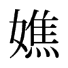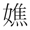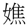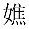 ◎ 康熙字典解釋 【丑集下】【女字部】 嫶; 康熙筆畫:15; 頁碼:頁270第38【集韻】慈焦切【正韻】慈消切。??同憔。【前漢·外戚傳】嫶姸太息。【註】晉灼曰:三輔謂憂愁面省疲曰嫶冥,嫶姸猶嫶冥也。 又【集韻】茲消切,音焦。女字。 顦癄醮焦蕉??通。