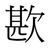 ◎ 康熙字典解釋 【辰集下】【欠字部】 歁; 康熙筆畫:13; 頁碼:頁569第18【唐韻】【集韻】??苦感切,音坎。【說文】食不滿也。 又【集韻】枯含切,音龕。意不滿。 又【集韻】丘咸切,音嵁。又丘檢切,音顩。義??同。 又【廣韻】口答切【集韻】渴合切,??音匌。歁歞,癡貌。