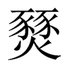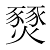 ◎ 康熙字典解釋 【巳集中】【火字部】 燹; 康熙筆畫:18; 頁碼:頁685第24【唐韻】【集韻】【韻會】【正韻】??蘇典切,音銑。【說文】火也。 又【玉篇】先踐切【廣韻】【集韻】息淺切,??音鮮。【玉篇】野火。【廣韻】字林云:逆燒亦作??。 又【集韻】許利切【韻會】虛器切,??音??。火也。 又【集韻】妨正切,音聘。火貌。 又敷文切,音芬。義同。
