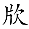 | 欿 | kǎn | 不自滿:“如其自視欿然,則過人遠矣。” ◎ 憂愁:“欿愁悴而委惰兮,老冉冉而逮之。” ◎ 古同“坎”,坑。 |